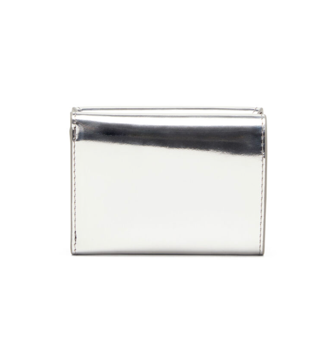 這款皮夾採用鏡面皮革製成,正面有品牌橢圓形D形金屬配件,採用經典的三折設計,並配有2個卡位、一個紙幣隔層和一個外部零錢袋。