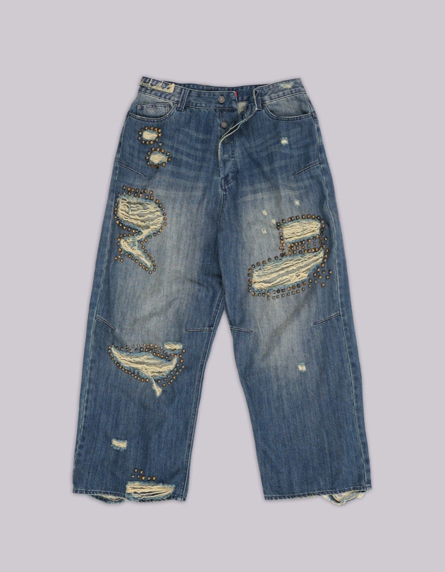 Jaded經典牛仔寬褲,使用硬質棉質牛仔布料,中藍色配色,破洞邊緣飾有鉚釘,使用仿古銀色五金配件,具有強烈仿舊效果。